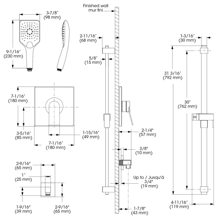- Douche à main - Débit : Débit maximal de 6,8 L/min (1,8 gpm) à 80 psi