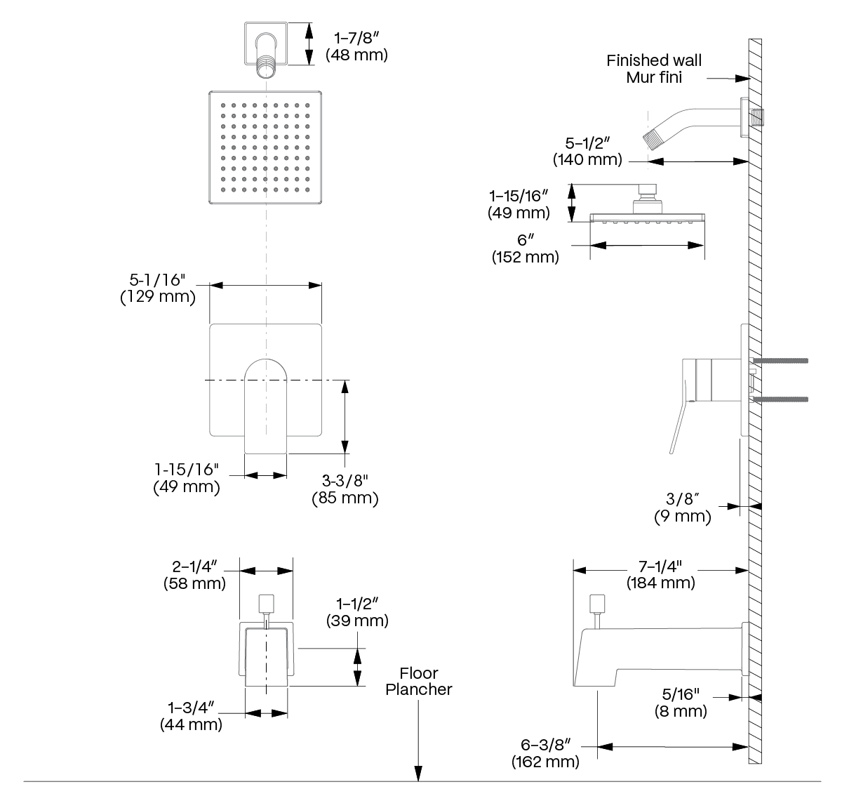 - Bec de baignoire de type Slip-on de 7 1/4 pouces avec inverseur intégré et diffuseur de jet