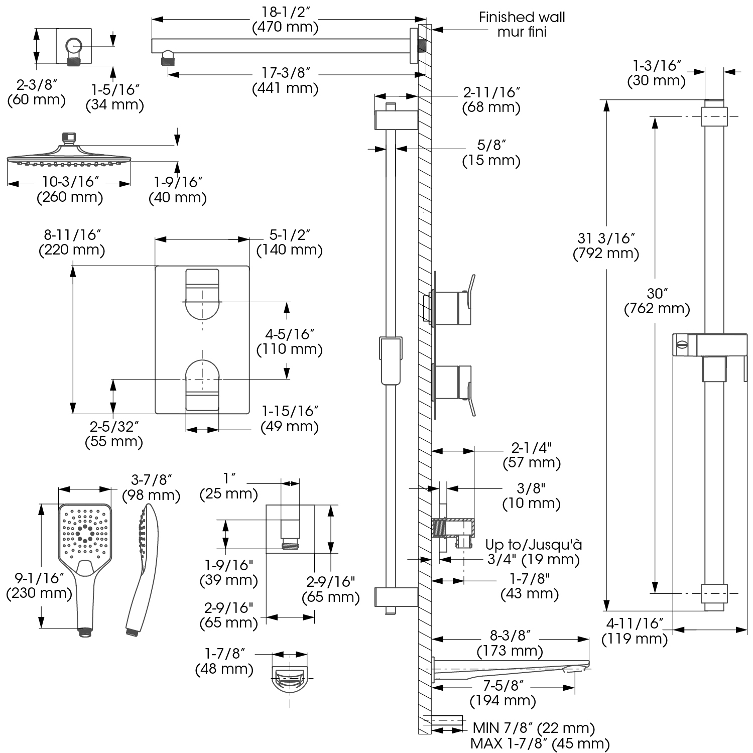 - Hand Shower Jets : 2 types of jets (spray, stream) 2 positions