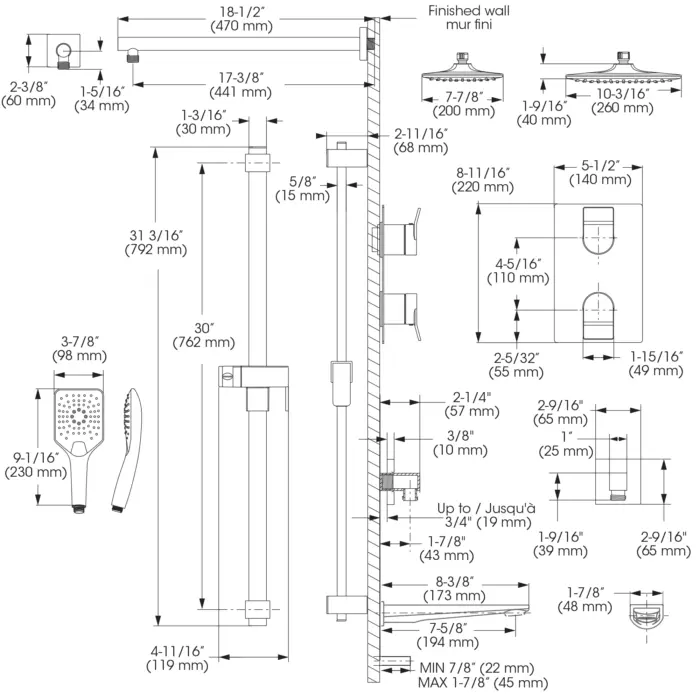- Hand Shower Jets : 2 types of jets (spray, stream) 2 positions